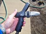 Although not earth shattering, here is the nozzle that I mentioned.  Tractor Supply has them for about $12 if memory serves me.  Great ergonomics for large hands, handles lots of volume well and shoots far as long as pressure is decent.   The U shaped handle controls the internal ball valve for instant on/off.