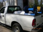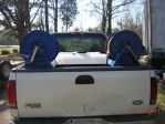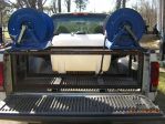 Had some time today, and broke down the setup for prep and paint. As you can see in the pic below, there are only 3 simple pcs. to this setup, and a handful of hardware in the yellow bin. I had it broke down and out of my truck in 10 min. (tanks are empty and there is no plumbing as of yet). I used a sanding wheel to clean up all the steel items and cleaned with Evapo-rust (Great stuff) as a preventive measure. Then applied the bed liner coating to all the steel parts. I am letting parts dry over night and will reassemble tomorrow afternoon. I set the hose reels the way I did so if I pull up in front of a customers home I can pull my yellow chem hose easily. The other 3/4 hose can be brought over the other hose reel as a guide and pull easily as well. Same concept applies if I pull in a driveway. I do not think the reels mounted to pull from the back are very user friendly, at least not the way I work.