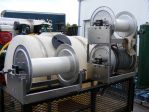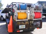 4 Full Frame, Stacked Titan Hose Reels: Models TT43XX and TT43XX with a stainless manifold and a TT4022 or 28 (1" manifold for the garden hose), 2 x stainless steel stack kits with 3/8" Blue and (old) Grey Non-Marking High Pressure 2 Wire or R2 Hose with a 3/8" Ball Valve (6292) and Mosmatic Inline Gun Swivel on each set of Hoses (Street 45's composed of Steel and Brass were installed after the picture was taken to allow the hoses to lay flat against the spools), 5/8" Yellow Ag hose for use with the All-Flo Air Diaphragm pump as a soft wash or roof wash application hose with brass fitting crimped on to the ends using one of our hydraulic crimpers (Crimped Ends mean that there are NO HOSE CLAMPS to watch out for!!!), a 1/2" Poly 90 Degree Hose Reel Swivel Upgrade for the chemical reel that resists corrosion, a length of 3/4" ID Kuri Tec Garden Hose plumbed to the tank using a 1"HIGH Temp Hudson Float Valve, 1" Poly Bulkhead, and Hudson Inlet Assembly usually assembled using SCH 40 or SCH 80 PVC fittings(Polypropylene fittings are too soft and will fracture under stress and especially in this location), high pressure custom cut, crimped and installed jump hoses using the 1/2" MPT ferrules and a 3/4" ID Yellow Ag hose to supply to All-Flo is attached to the bottom left reel.