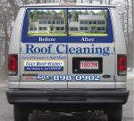 Brian i would put your company name under the windows. Move the phone number under your company name and underneath the "roof cleaning " and soft wash" i would put experts in roof and exterior cleaning. The colors and to me just arent jiving with eath other. Or Just Pust " GOT ROOF STAINS across the top drop the pictures underneath them your logo on the doors with your phone number under that and rcia certified somewhere. There is just so much you can do or you can call kieth and have him design it and send the art work to your sign guy and have them install it.