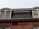 The other issue is the roof, the front looks totally black, with some light green moss/lichen where the roof starts. The back (south side) has black just under the ledge, but the rest of the roof is grey, which appears to be the original color,  the photo of the back appears to have some spilled white paint on the shingles.